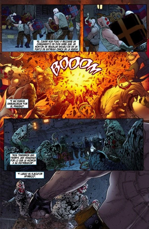 En la base del Joker, sus hombres le informaron de que había un hombre con un solo brazo en el bando del Pingüino. El Joker se levantó y junto a Harley, se montaron en el vagón de inicio de una montaña rusa, y mandó a sus hombres montarse en los vagones siguientes. En cierto punto del recorrido, el payaso criminal pulsó un botón y todos los vagones en los que iban sus hombres se dirijieron hacia un tanque con ácido, muriendo por haber fallado la recogida.