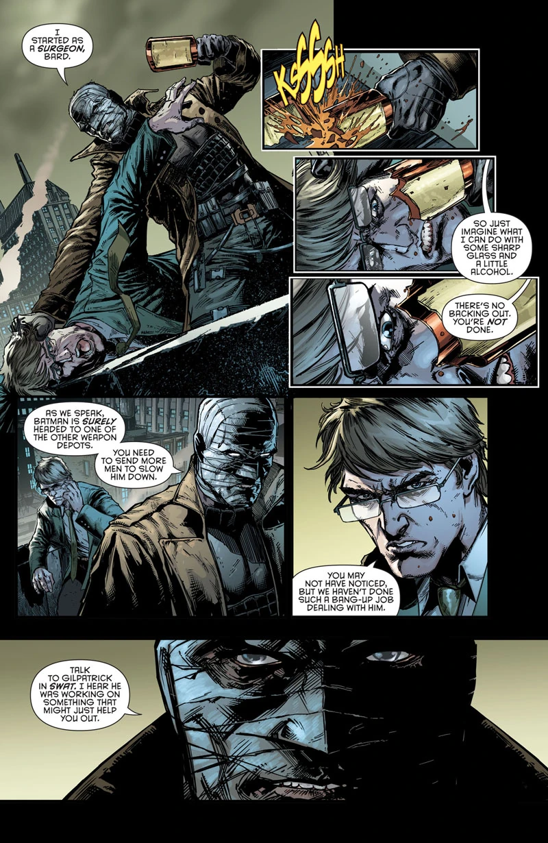 Repentinamente un helicóptero de SWAT los sorprende y de él salta un sujeto fuertemente armado con traje y escudo antimotines, quien se abalanza contra Batman y lo hace caer al suelo. El héroe se da cuenta de que aquel sujeto era nuevo en la ciudad cuando le lanza un espuma de rápida solidificación que destruye su capa, por lo que él le da la bienvenida a su rival arremetiendo en su contra y cortando sus mangueras de succión para envolverlo completamente en su propia espuma. Al regresar al exterior él descubre que Julia ya había abierto el almacén por lo que solo jala una palanca que comienza a rociar acido sobre todo el contenido. Más adelante ambos se separan para destruir los siguientes almacenes, pero mientras eso sucede Lucius Fox se reúne con uno de los inversionistas de Wayne Enterprises e cual se encontraba sumamente preocupado de la noticia divulgada por Vicki Vale con respecto a las armas de Batman diseñadas por aquella compañía. Ante aquel problema Lucius se comunica con Bruce para que este a su vez se comunicara con Batman para que les asegurase que no habría ningún otro tipo de incidente con las armas. Mientras el Caballero Oscuro se encarga por acabar con otro de los almacenes Alfred ignora su periodo de descanso para monitorear las señales de la policía e intentar encontrar a Hush. Sin embargo, el mayordomo no puede evitar sentirse preocupado por su hija ya que a pesar de que esta estaba más entrenada que Dick, Jason, Tim y Damian, la ciudad tenían la capacidad de arrebatarle a todos sus seres amados. En ese preciso instante Julia consigue acceder a otros de los almacenes pero repentinamente Hush se aparece por detrás, portando un arma y preguntándole quien era ella.