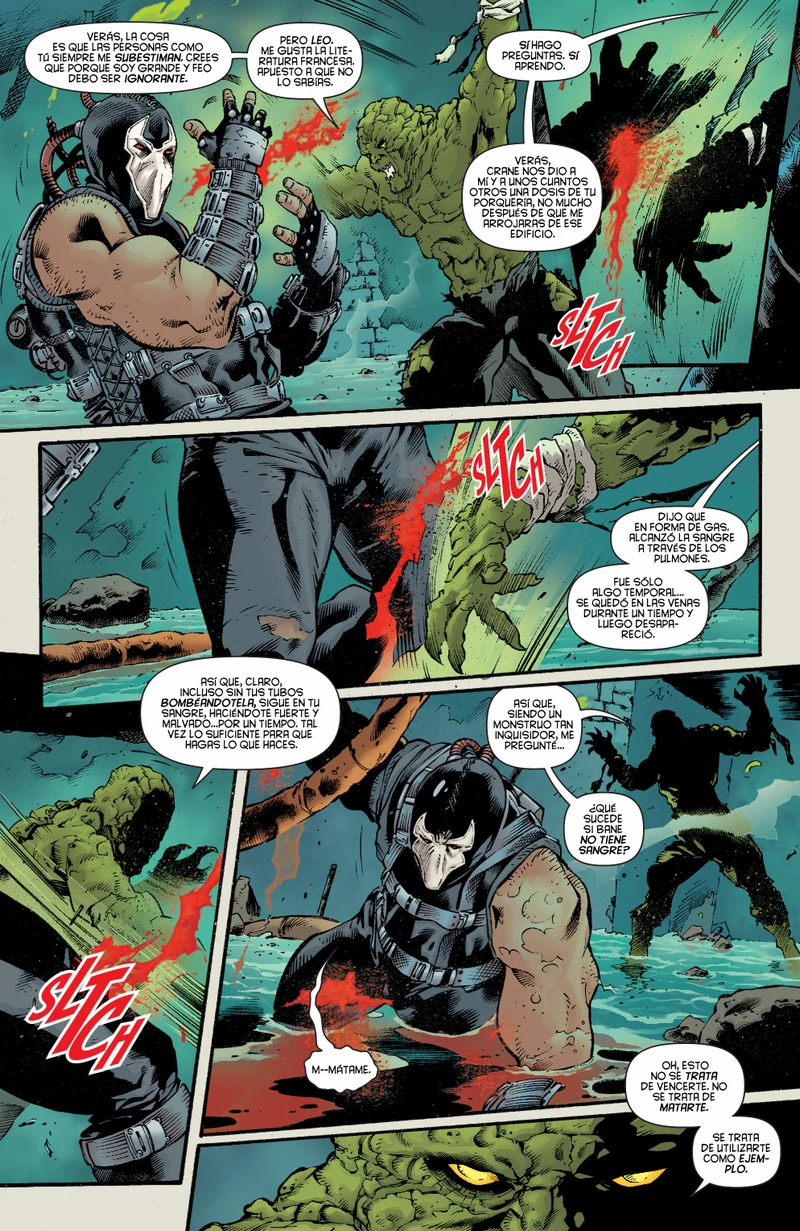 accidente del metro por lo que le ofrece una oportunidad para escapar de allí pero Jim la rechaza ya que él aun creía en sistema que regia Ciudad Gótica. En Willowwood, percatados de la presencia de Batman luego de que este noquea a la Hija del Guasón con una granada somnífera, Bane y Hiedra emprenden la huida por los túneles del alcantarillado pero ambos se terminan separando cuando el mercenario se da cuenta de que la villana lo había estado manipulando con sus feromonas. Inesperadamente Killer Croc emerge del agua para vengarse de Bane por su derrota en la torre Wayne. La superioridad en combate de Bane rápidamente salta en escena tras asestarle varios golpes mortales a su rival, no obstante Croc se aprovecha la ventaja de estar peleando en su entorno y le corta a Bane una de sus mangueras bombeadoras de Venom .