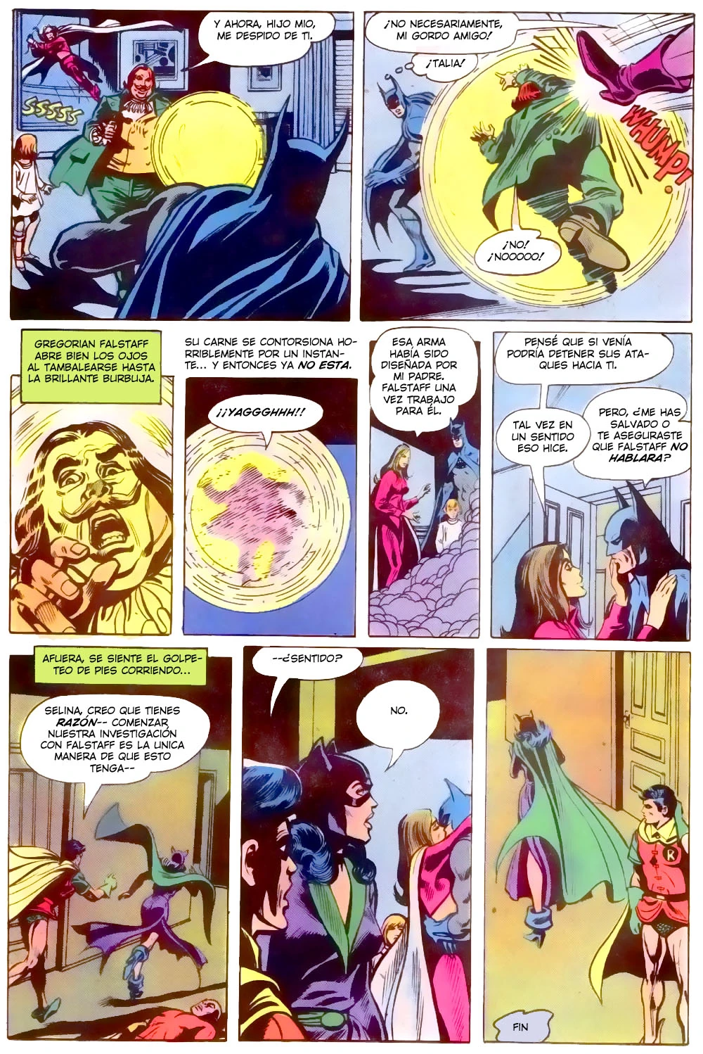 "La presencia de Talia en la vida de Bruce ha hecho que el dúo dinámico se separe, a la vez Gregorian Falstaff esa dando los últimos ataques a las compañías de las empresas Wayne... pero hay indicios de que Falstaff esta trabajando para un tercero ¿pero quien?. Además en este número Gatúbela aparece por primera vez en una aventura en solitario. Pero ¿busca ayudar a Batman o solo tiene celos?"
