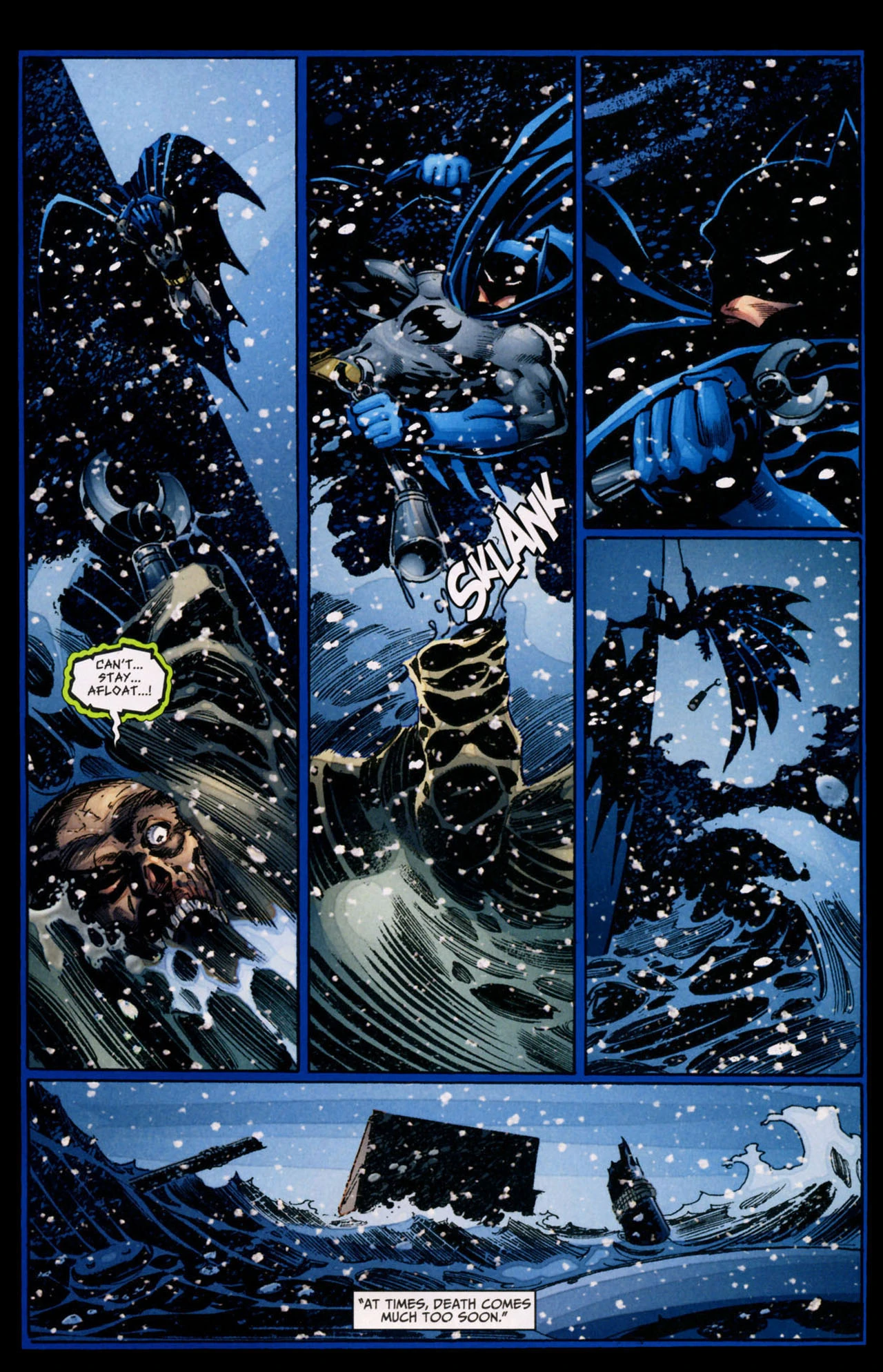 Momentos más tarde, cuando la tormenta ha desatado gran parte de su poder, Grotesco llega al puerto y roba un velero para escapar cruzando el rio mientras que Batman intenta llegar rápido con Amina hacia un hospital, pero todo resulta en vano y la doctora termina muriendo sus brazos tras pedirle que detenga a su hermano. El héroe logra localizar rápidamente el velero en que el villano intenta huir, por lo que se lanza al combate nuevamente sabiendo que esta vez no tiene a nadie a quien poner en peligro para escapar; Batman se provecha de sus escasos conocimientos de lucha y le administra una dosis de droga paralizante para detener el conflicto. Finalmente derrotado Wayne pide clemencia por sus actos pero Batman simplemente decide ignorar sus suplica, por lo que al villano no le queda más remedio que incendiar el barco para cavar con ambos. A causa de la tormenta ellos no logran ver que un barco carguero se acerca hacia ellos a gran velocidad por eso en el ultimo instante Batman logra engancharse del otro barco antes del impacto pero Wayne no corre con la misma suerte y las aguas del rio comienzan a tragarlo a pesar que Bruce intenta salvarlo, pero ya es muy tarde para Grotesco. Días después, luego del velorio de Amina, se revela que no se encontraron rastro de Wayne por lo que se presume que se ahogo, y en efecto su cuerpo permanece congelado en la aguas del rio por el que intento huir.