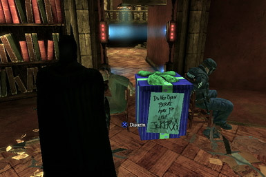 Shaking off the effects of the fear gas, Batman awakes inside the Morgue. Batman leaves the Morgue and finds Scarecrow's gas had him believe something that wasn't real, finding a fallen security guard where he had seemingly found Gordon's corpse earlier. Batman realizes that Gordon is still alive and follows a trail left for him by the Joker to the scene of a vicious little game set up for him. Harley is guarding Gordon, and Joker challenges Batman to make it undetected past four of his henchmen patrolling the room; if he is spotted Harley will execute Gordon instantly. Once Batman succeeds, the Joker directs his attention to a surprise left for him in a previously locked chamber in the middle of the room.