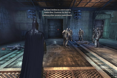 After being forced to contend with more gun-wielding thugs, Batman enters the Arkham Mansion through the air ventilation system. After defeating three of the Joker's men in the Entrance Hall, he fights his way through the Main Hall and enters the West Wing Corridor, where he rescues Arkham staff member Kevin Liew and an asylum guard. He notices 'Suicide Collars' worn by some of the Joker's henchmen, electronic devices that sound an alarm when it detects sudden heartbeat changes in the inmates. Batman then rescues Aaron Cash and another Arkham guard being held captive by a group of armed Blackgate convicts in the Records Room.