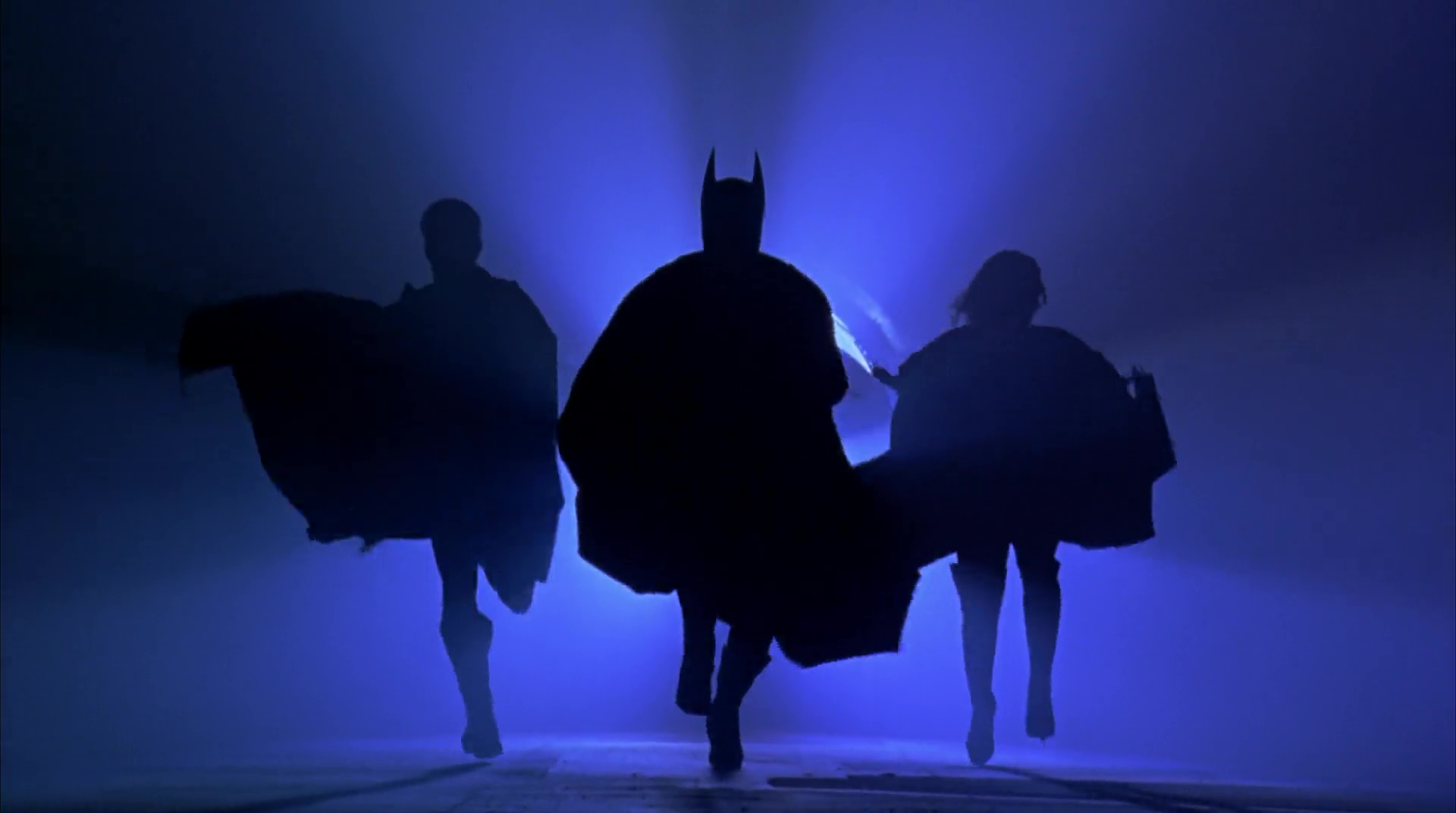 Batman, Robin and Batgirl running with the Batsignal in the background, during the end of the movie.