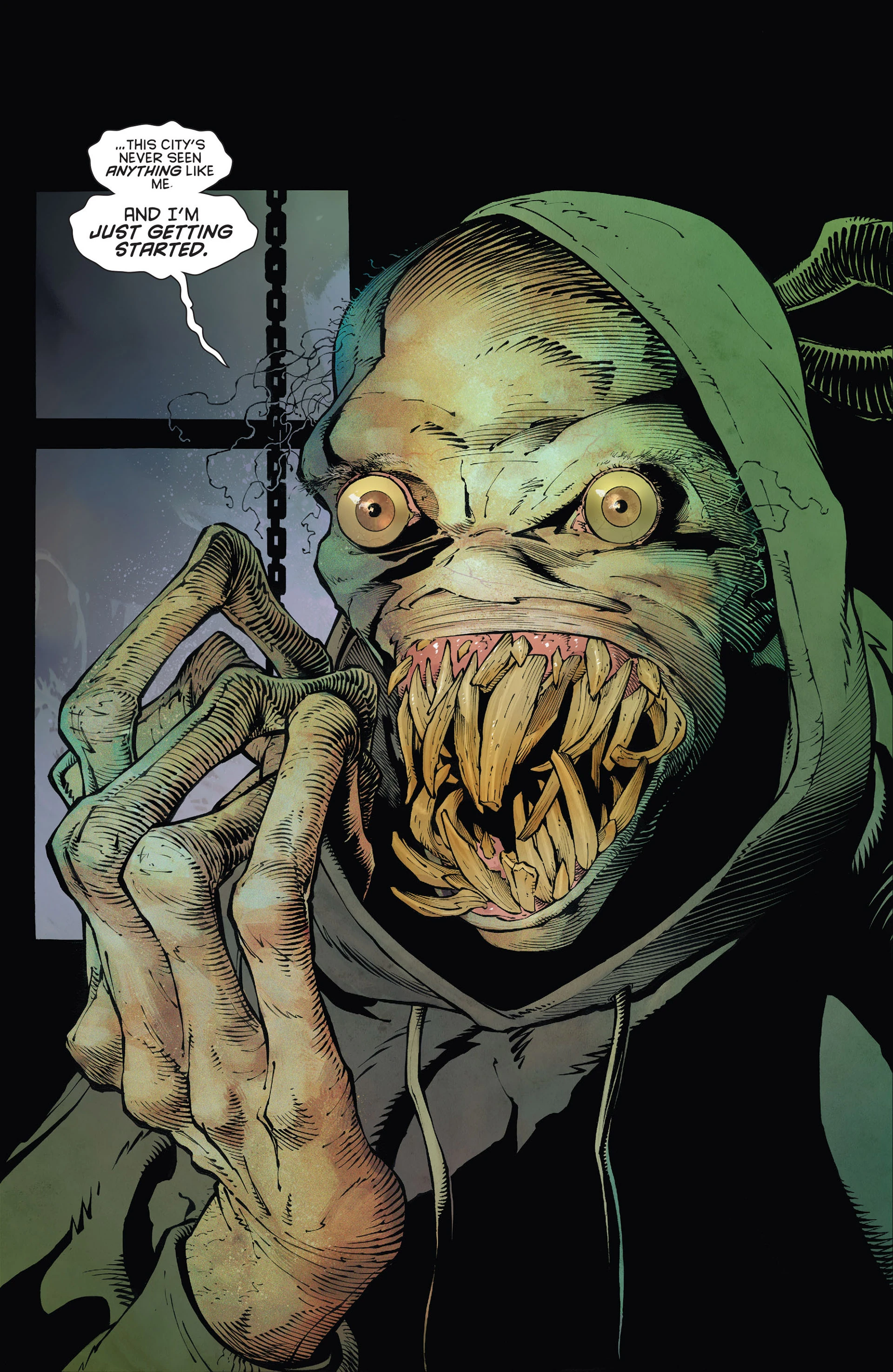 Doctor Death remains active in the DC Universe following the events of Infinite Crisis. In the second issue of 52, he is mentioned as one of many mad scientists who have gone missing. He is depicted later in the series among other captured scientists and mad geniuses on Oolong Island. His appearance was also radically altered at this time, depicting him as having lidless eyes, extremely long skeletal fingers, a bald head with only a few matted strands of hair, no nose, as well as several rows of jagged fangs in his mouth, as well as wearing a green cloak. He also implies that this was his first visit to Gotham City.