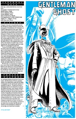 Gentleman Ghost, formerly known as "Gentleman" Jim Craddock was originally a Hawkman foe, though the spectral charlatan also battles Batman several times. He wore a white suit and pipe hat and used a variety of ghost-like weapons including twin pistols and a staff.