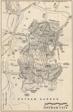 Maps shown in various comics have depicted the city in different places. Many of the maps directly use Manhattan, Vancouver, and other real coastlines as their basis, while others are completely original. One map showing Gotham City in relation to Metropolis, the home of Superman, published in New Adventures of Superboy #22 (October 1981), placed Gotham City and Metropolis on opposite sides of a large bay. In Swamp Thing vol. 2, #53 (October 1986) the geography of Rhode Island was the basis of another map of Gotham City. The current definitive maps of Gotham City are those based on the ones produced for the "No Man's Land" story arc.