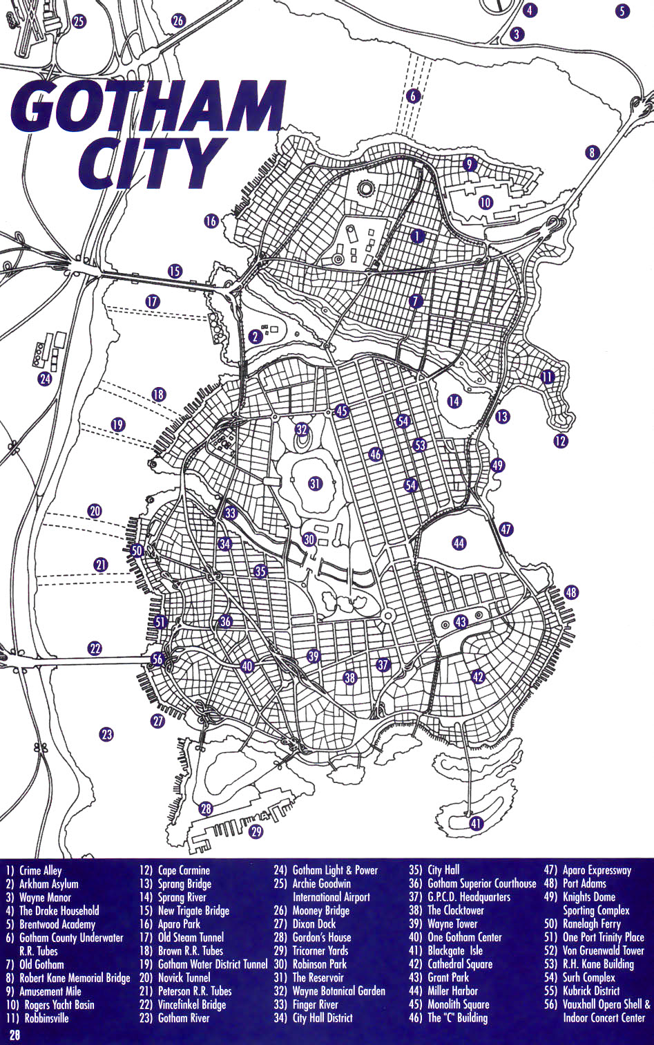 In addition to Arkham Asylum, other major facets of Gotham City seen in Batman and related comics include: