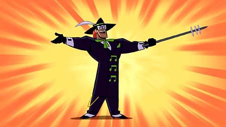 The Meister's main power is his singing voice, which creates a pitch so high that it hypnotizes people. In their state of hypnosis, it causes his victims to sing and dance too. He has a rod (roughly shaped like a conductor's baton) that can fire energy blasts shaped like music scores. He is also seen riding on a motorcycle shaped like a paired eighth notes; at one point, the cycle splits into a pair of Segway-like scooters, now resembling separate notes (he and Batman race across telephone wires, like notes in the song being sung during the chase). He also seems to have the uncanny ability to change his outfits befitting different eras in music history extremely quickly, such as Cab Calloway's zoot suit and Elvis's disco suit (as seen multiple times throughout the episode, its colors also reference Marvin from Super Friends ). Other costumes reference Liberace, The Music Man, Hair, Amadeus, country/western music and Wagnerian opera. The building he holds Canary and Batman in is known as "TB&TB". This is a reference to the now defunct punk rock bar CB-GB's; it is also the initials of the series.