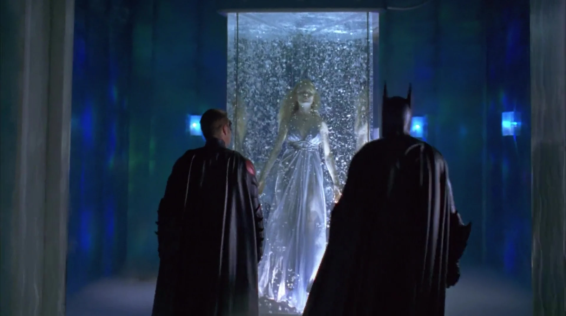 After he was captured by Batman, Freeze was imprisoned at Arkham Asylum, was upset about his separation from his wife, and carved an ice statue of her in order to get some solace. He was soon rescued by Poison Ivy and Bane. They all returned to Freeze's hideout to retrieve his diamonds, weapons, and Nora. Freeze got his belongings while Bane fought Batman and Robin with Ivy using her mind control dust to turn them against each other. After she got Batman and Robin to fight each other, Ivy escaped with Bane to the room where Nora was kept.