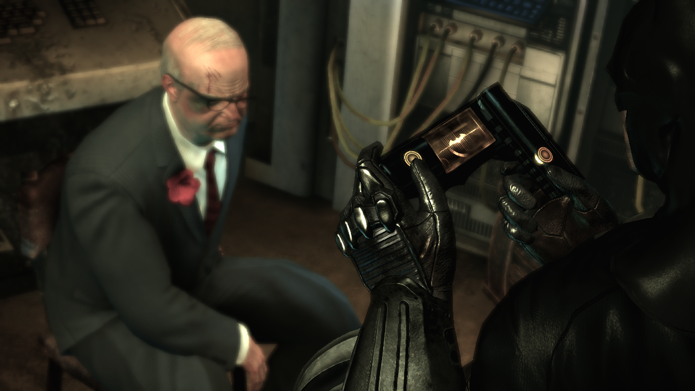 Batman receiving Warden Sharp's security clearance codes after he found him in the Security Control Room at the Penitentiary.
