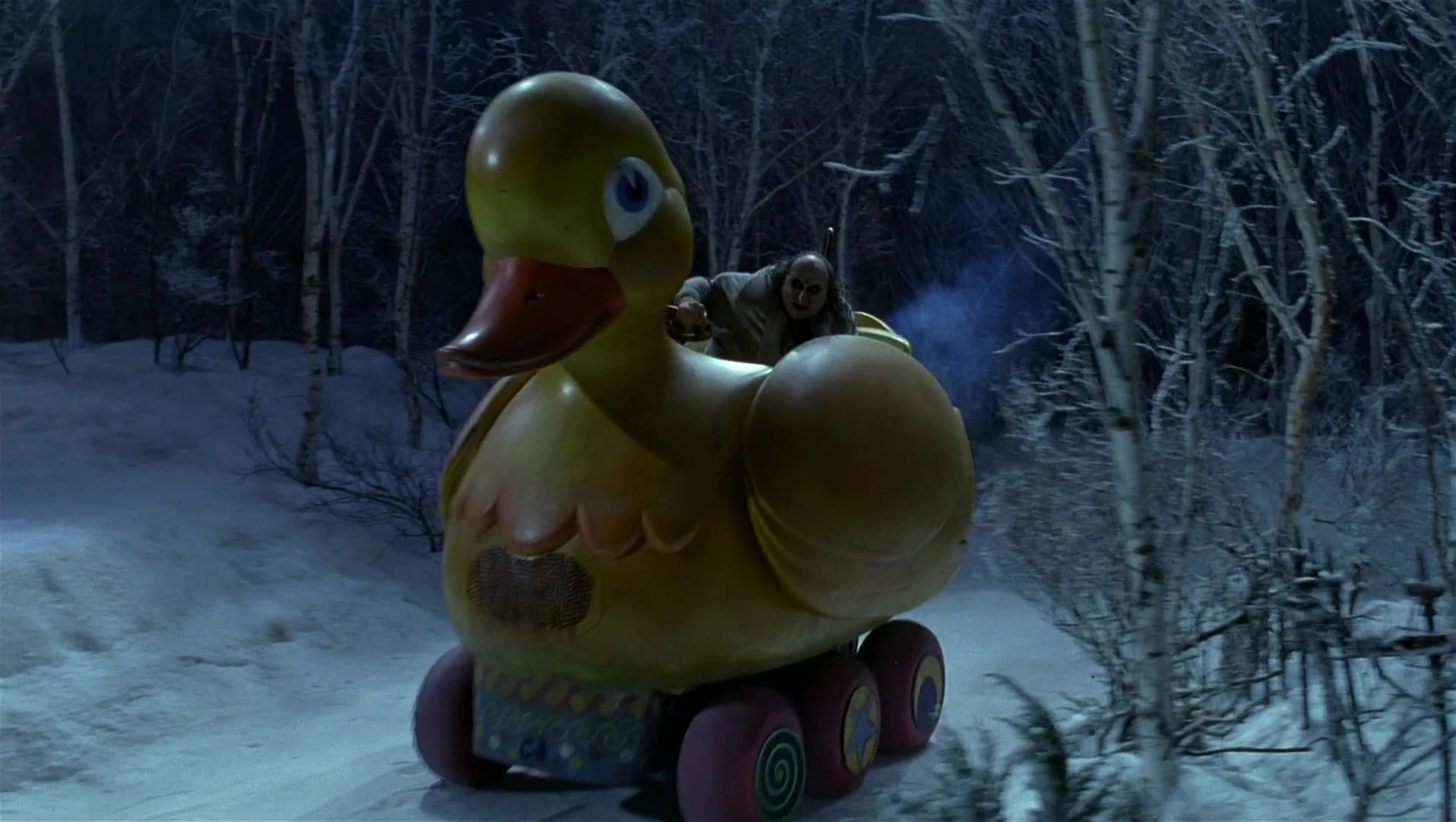 The Duck was part of a cable system featuring many different animals for families to be seated in during a tour like bears and rabbits. After returning to the abandoned zoo years later with the disgraced Red Triangle circus, Penguin settled in the Arctic World exhibit where he was raised. Here, he began use the duck boat as a personal transport, not only because of an obsession with birds, but also because of its resemblance to the small rubber duck toy that dangled just out of his reach in the cage his parents made for him at the Cobblepot mansion. The yellow paint on the Duck is now faded and smudged, with signs of heavy weathering and chip damage, giving its cheerful appearance a disturbing quality.