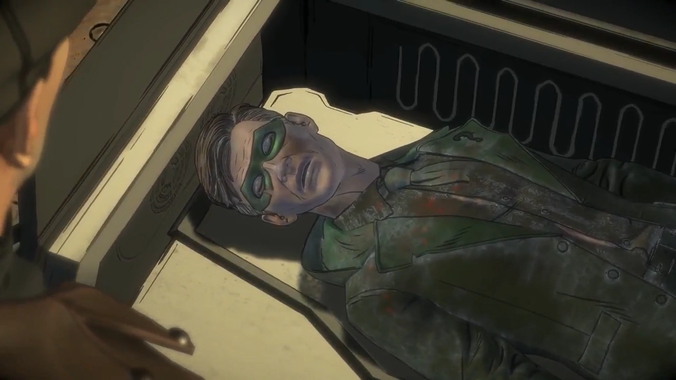 After realizing that John had set him up, Riddler was shot by a poisoned dart from a drone operated by Lucius' daughter Tiffany, who was investigating her father's murder. As he died, he mentioned how they had "broken the Pact". This comment caused Batman to realize that John and "his friends" had been involved with Riddler and his actions.