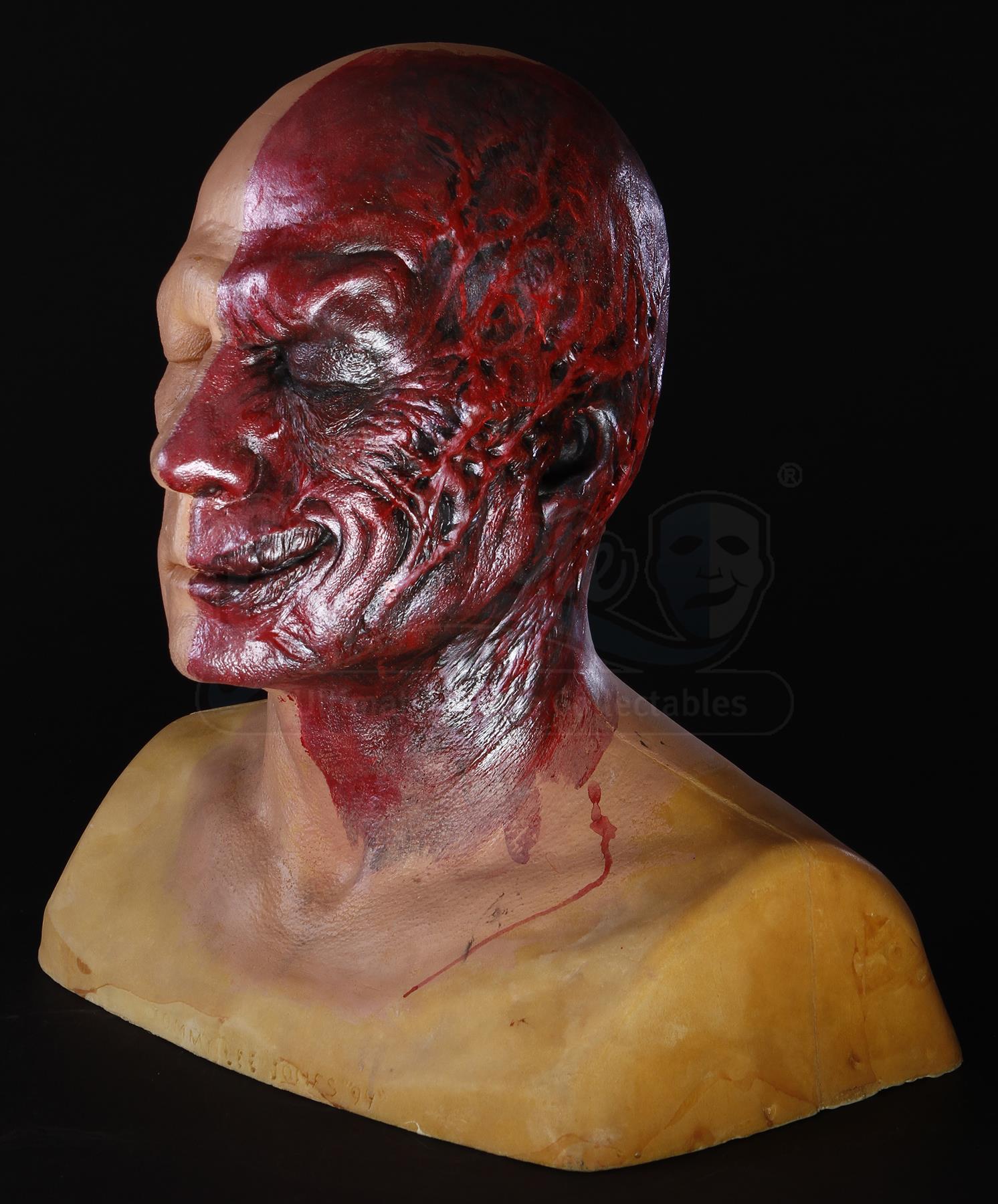 Two-Face's design was originally going to be more graphic, with a bulging eyeball and exposed teeth on the left side. Rick Baker wanted to portray these iconic qualities early in the design process. However, these were quickly vetoed to make the film more family friendly. The initial dark red paint job was changed to a brighter, chromium-Fuchsia color.