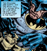 The Utility Belt is the iconic storage device used to carry most of Bruce Wayne's gadgets and equipment over his Batsuit. Often depicted as part of the Bat-Family members' costumes, it is used to house various equipment for the heroes to use or access at short notice. The exact contents of this belt are not known and Batman usually changes them to suit his needs. In some stories, his enemies have attempted to steal or replicate the utility belt, believing it will give them an advantage over him.