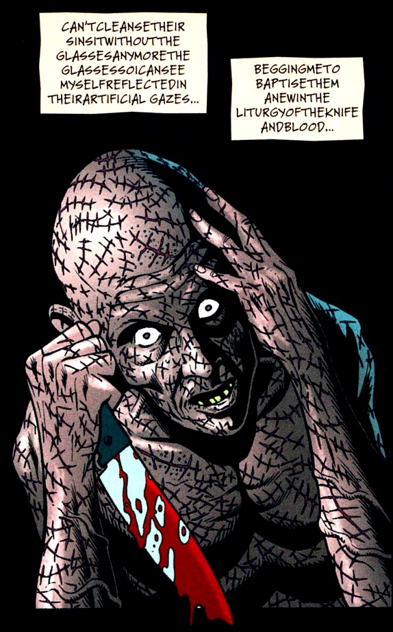 Although Mr. Zsasz is restrained during the daytime when he is being treated personally by Dr. Jeremiah Arkham, he is brought back to his cell at night where he would leave the asylum through the secret passage, unbeknownst to the prison-guards. After murders fitting Mr. Zsasz's modus operandi begin surfacing, Batman and Commissioner Gordon fake the Caped Crusader's insanity in order to get him inside the asylum and investigate Mr. Zsasz. Dr. Jeremiah Arkham is exceptionally brutal towards Batman, who had supposedly murdered a police officer; over the course of the "treatment," Mr. Zsasz had warped Dr. Jeremiah Arkham's mind and turned him into a mere henchman. Due to these continuous conversations with Dr. Jeremiah Arkham, Mr. Zsasz realizes that Batman is a plant and subsequently murders both the contractor and another inmate at Arkham Asylum who knows of Mr. Zsasz's ploy. However, both Nightwing and Batman catch up to Mr. Zsasz when he tries to escape for the final time and re-incarcerate him in Arkham Asylum. Mr. Zsasz later appears in Part 3 and 4 of the Knightfall saga. In Part 3 of Knightfall, Mr. Zsasz takes an all girl's college hostage and holds the students at knife point until Batman arrives, briefly leaving to kill two policemen who were sent to arrest him. Though weakened both physically and mentally, Batman fights with Mr. Zsasz and tries to ignore the lunatic's mockery. However, he is finally driven partially insane after Mr. Zsasz says that they are really one and the same and administers a savage beating. In The Batman Chronicles #3, a psychiatrist found herself unable to understand why the serial killer did what he did. "You don't exhibit the usual signs of mental illness. No voices, no hallucinations, no dementia. Why do you kill?" she asked him.